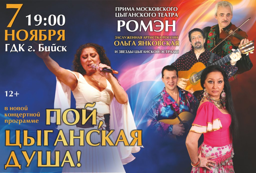 Прима Московского цыганского театра «Ромэн», заслуженная артистка России Ольга Янковская вместе со своими коллегами к 85-летию театра подготовила программу «Пой, цыганская душа!», в которой прозвучат цыганские народные песни, цыганские и русские романсы, инструментальная музыка.