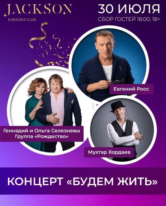 Дорогие друзья! 30 июля в 18:00 караоке-клуб «JACKSON» приглашает Вас совершить удивительное путешествие в мир душевной музыки, в мир созвучия чувств и переживаний русского Шансона. На нашей сцене, вы сможете увидеть и услышать знакомые лица и голоса. Споем вместе с любимыми артистами, такими как: