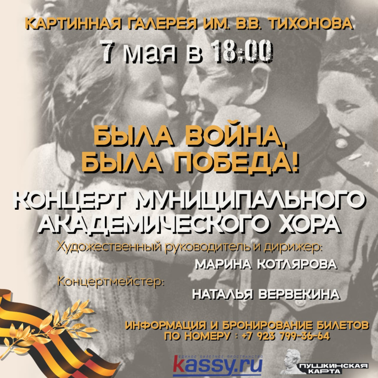 7 мая в 18.00 в картиной Галерее им. В. В. Тихонов состоится концерт "Была весна, была Победа!". Концерт посвящён 78-летию Великой Победы. В программе прозвучат произведения А Александрова, А Новикова, М. Блантера, Н. Богословского, Я. Френкеля, Д. Тухманова и многих других.