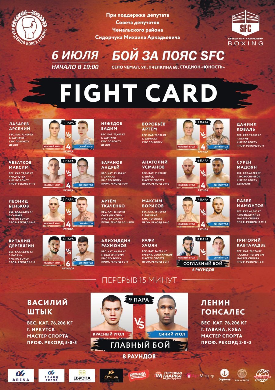 Его соперник из Кубы, Ленин Гонсалес, первый номер юношеской сборной Кубы, профрекорд 0.2.1. Он уже знаком любителям бокса Сибири, по бою против Вадима Лубсанова, который состоялся 22 декабря 2022г в г Барнауле и закончился в ничью.Соглавный поединок вечера 8 раундов